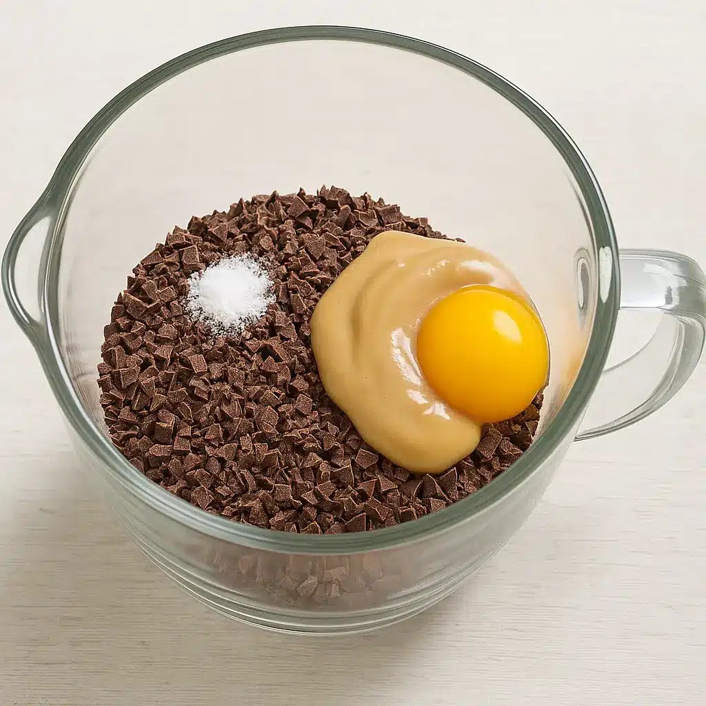 שמים בקערת בלנדר את השוקולד, הטחינה, הביצה והמלח וטוחנים לאיחוד קל.