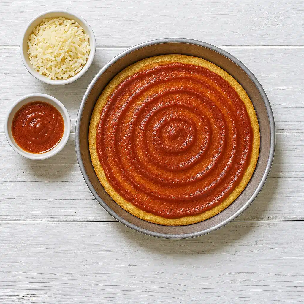 מוציאים את התבנית מהתנור, מורחים מעל התחתית את רוטב העגבניות, מפזרים את הגבינה וממשיכים לאפות כ-8 דקות נוספות עד שהגבינה נמסה ומזהיבה יפה.